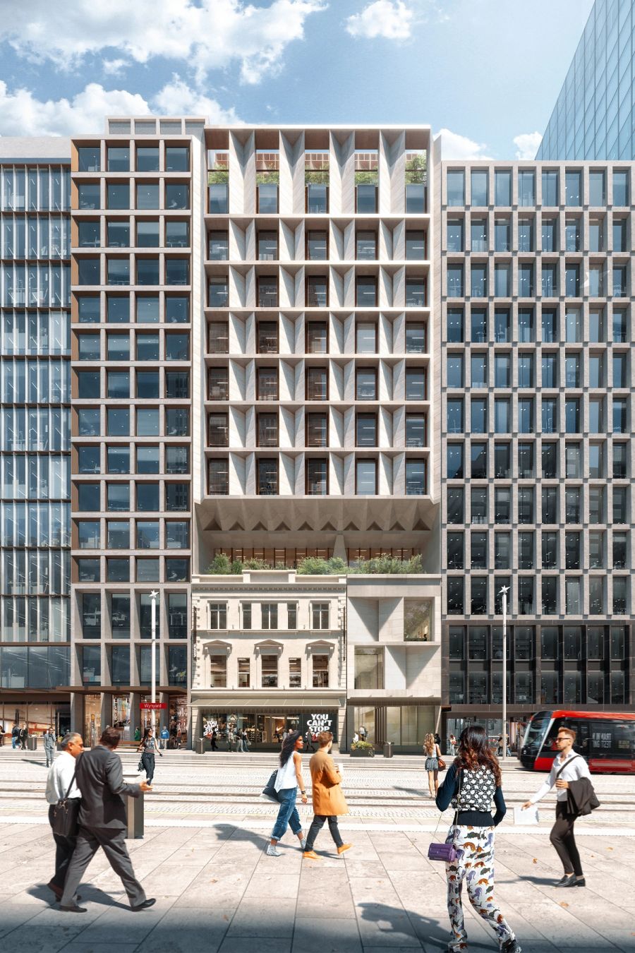 An elegant new 14 storey tower inclusion in the George Street urban wall is contextual and specific to place.