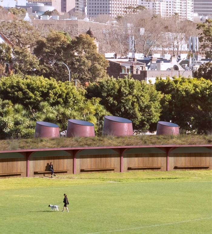 On a prominent location in Moore Park at the edge of South Dowling Street, the facility replaces a poorly sited amenities building with a new and enlarged building providing change rooms and bathrooms for boys and girls, as well as club facilities. The building nestles into an existing topographic rise, reinstating and reinforcing natural desire lines from the North, from the North-West and to the South of the facility. The facility appears as a landscaped roof from the key viewing point on (the grandiosely named) Mount Steel, with sculptural light canons reaching up through gardens.
