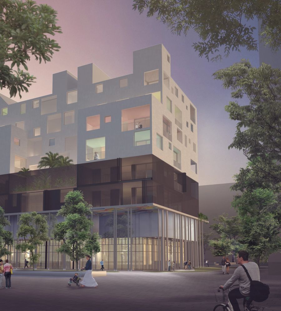 The roof form recalls the industrial built heritage of Waterloo, referencing the nearby sawtooth roof and factory chimneys. The recessed ground floor retail was designed to increase the connectivity of the building to the surrounding public space and parklands.
